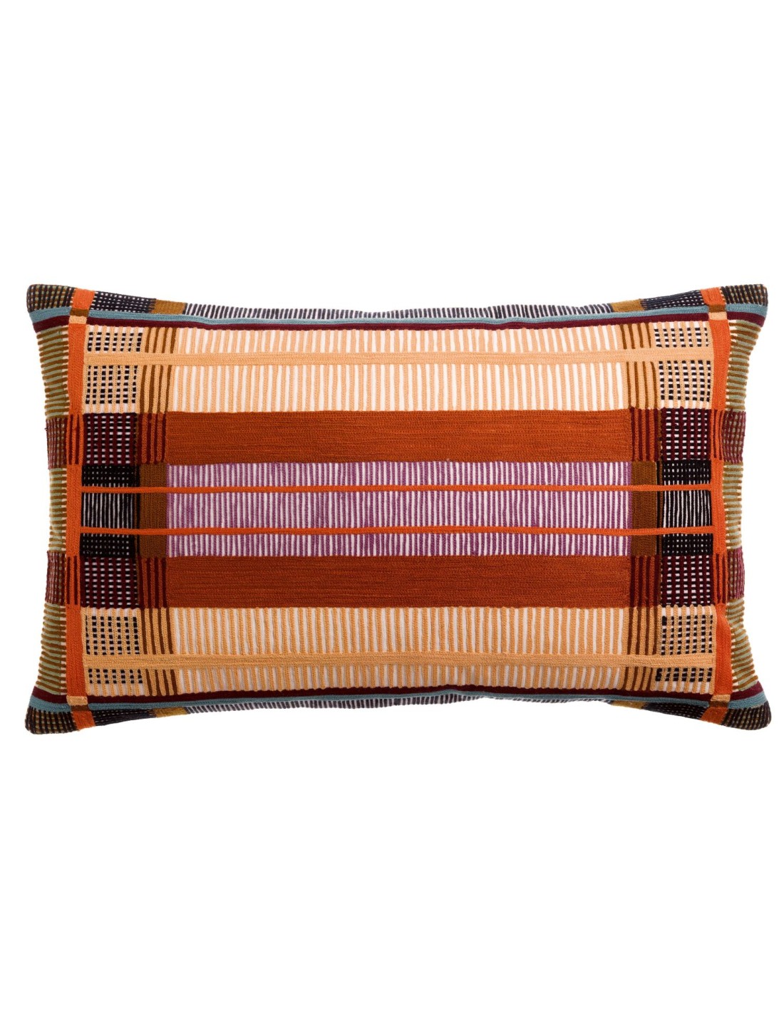 Η εντυπωσιακή αντίθεση μεταξύ του καθαρού chambray πίσω μέρους και του γεωμετρικού κεντήματος στο μπροστινό μέρος καθιστά το μαξιλάρι μια τολμηρή διακοσμητική δήλωση. Το αόρατο κλείσιμο με φερμουάρ διατηρεί την εκλεπτυσμένη αισθητική, απλοποιώντας παράλληλα τη συντήρηση αυτού του μαξιλαριού από 100% βαμβάκι.