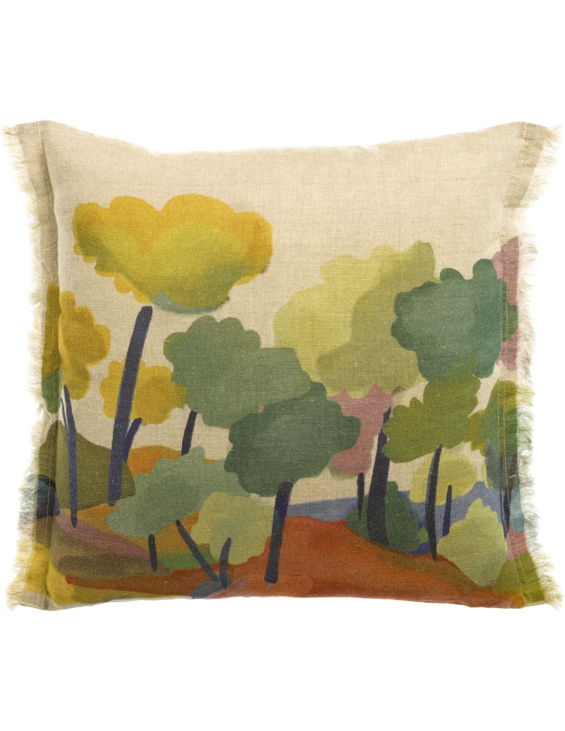 Invite nature indoors with the Zeff Melio cushion. A linen front enhances the painted landscape motif and its delicate, luminous tones, while the cotton back feels soft and supple. Fine fringes add an authentic bohemian touch. On a sofa, armchair or reading nook, it sets a calm, poetic mood.