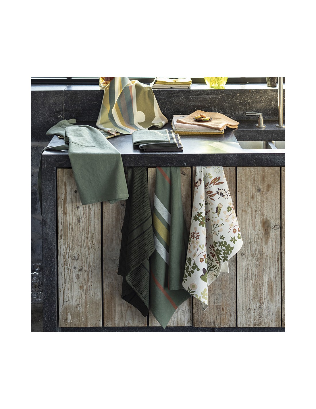 Nature enters your kitchen with this Darian kitchen towel with floral, animal and plant patterns. It is made of 100% recycled cotton. You can also find the same pattern on the kitchen apron and pot holder for a beautiful harmony.